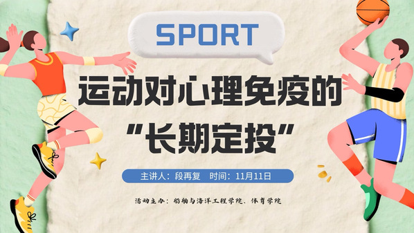 为积极回应新生适应期心理需求,助力学子夯实心理健康基石。11月11日下午,体育学院与船海学院创新合作,面向两个学院全体新生心理委员和宿舍长成功举办了“运动对心理免疫的‘长期定投’”心理健康专题讲座。本次活动特邀体育学院资深教师、在运动与健康促进领域颇有研究的段再复老师担任主讲,为初入大学校园的学子们带来了一场别开生面的心理滋养课。