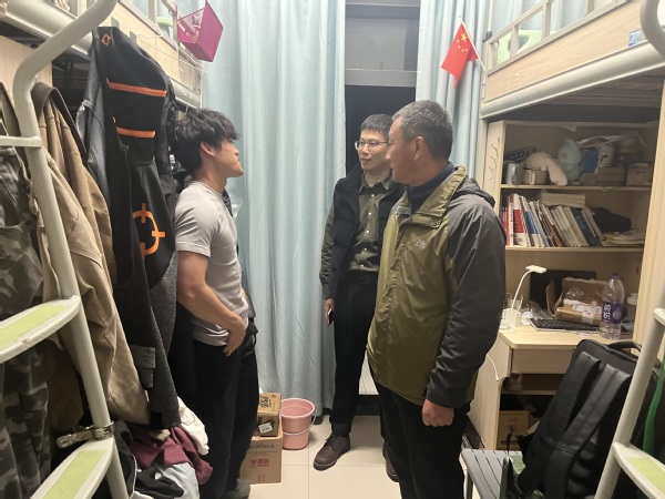 初冬的夜晚透着丝丝寒意,学生宿舍内却洋溢着融融暖意。晚上七点,学院领导团队分成若干小组,开始了这场特殊的“家访”“最近学习压力大吗?”“生活上有什么困难?”“对学院工作有什么建议?”在走访过程中,党委书记陈昱与同学们亲切交谈,详细了解每位同学的学习生活状况。他特别叮嘱同学们:“宿舍不仅是生活场所,更是成长成才的重要阵地。我们要把思想政治工作做到宿舍里,做到同学们的心坎上。”
