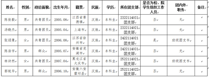 各班级: 体育学院已按学校学生代表大会代表的分配名额及构成要求,经学院内各班级团支部推荐酝酿后,积极召开体育学院学代会选举产生出席学校学代会的学生代表共6人,其中校、院学生会组织工作人员人数为2人,党员0人,团员4人,女生代表2人,少数民族代表0人,先公示如下: 公示期:2025.10.20-2025.10.23,电话:0511-84413922。