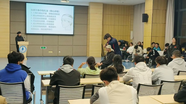 教学环节启动后,培训师通过视频演示结合真人示范,系统讲解心肺复苏和创伤包扎的技术要点。“手臂保持垂直施压”、按压频率维持在100-120次/分钟等专业要求,让学员们切实感受到急救操作的严谨性。
